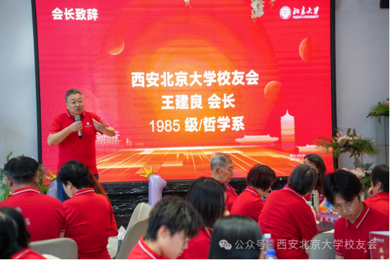 杨彬欢迎了新校友加入大家庭,并向在场新老校友介绍了西安北京大学校友会整体情况,他先回溯了校友会发展脉络:自1984年陕西北京大学校友会初建,至2001年正式注册在西安市民政局登记注册为“西安北京大学校友会”,迄今已形成完善组织架构。他详述三千余会员规模、理事会组成、历任会长及品牌活动,强调校友会始终是校友的坚实后盾与职业发展平台。致辞收尾,他引李白诗句激励全场“愿诸位持守燕园初心,长风破浪会有时,直挂云帆济沧海!”